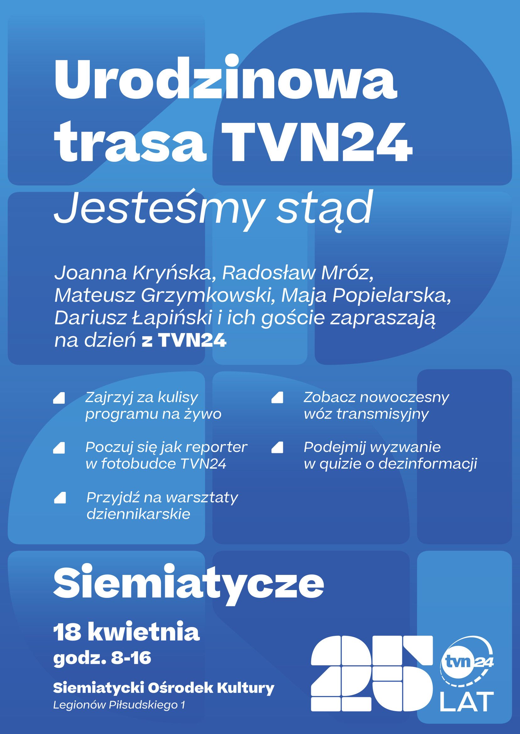 Urodzinowa trasa TVN24 w Siemiatyczach Już 18 kwietnia Siemiatycze znajdą się na mapie wyjątkowej trasy z okazji 25-lecia TVN24. To okazja, aby zajrzeć za kulisy pracy dziennikarzy i zobaczyć, jak wygląda telewizja od środka.