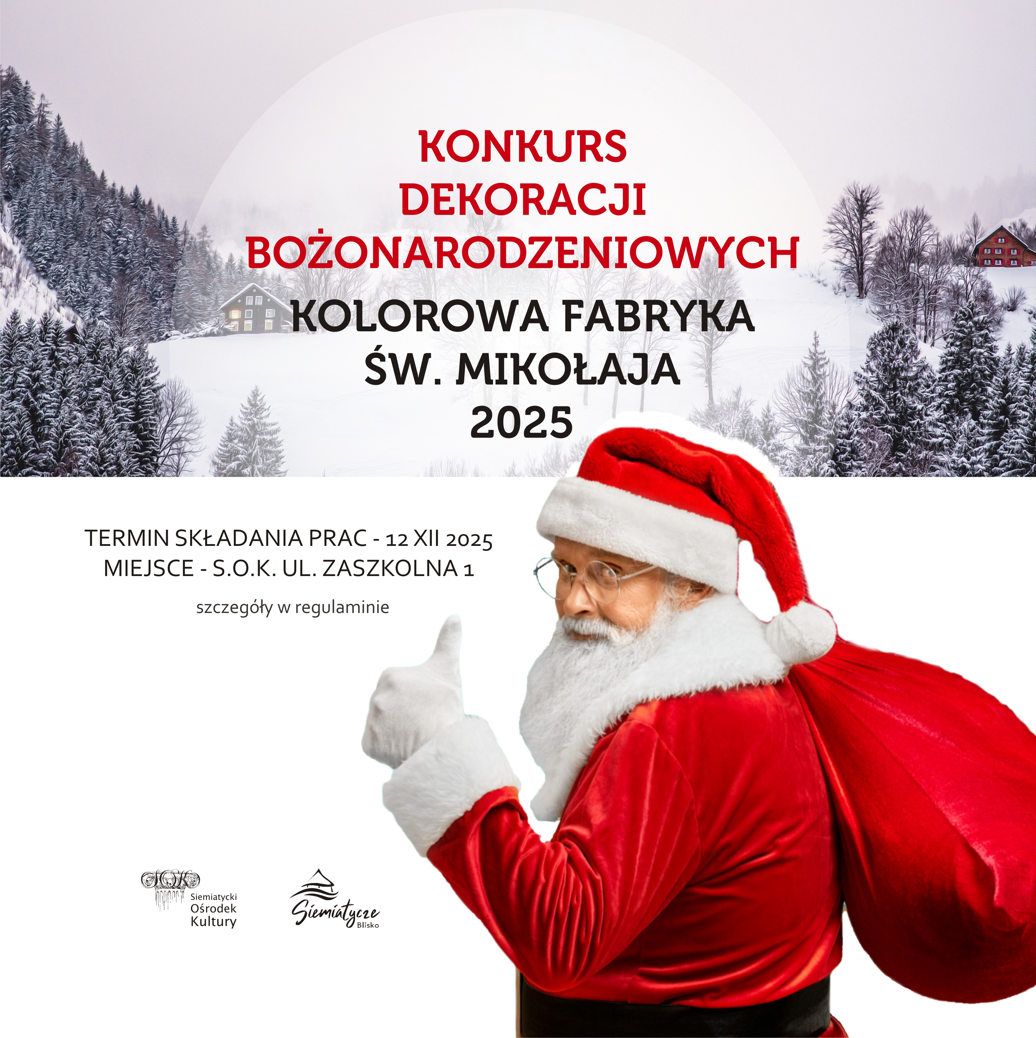 6. Terminy: - prace należy dostarczyć do 12 grudnia 2025 roku, do Siemiatyckiego Ośrodka Kultury, ul. Zaszkolna 1, - wystawę prac można oglądać od 20 grudnia 2025 roku w Galerii SOK ul. Zaszkolna 1, - o wynikach konkursu powiadomimy telefonicznie, - rozdanie nagród odbędzie się podczas Przeglądu Kolędniczego ph: „Hej kolęda kolęda...”- 15 stycznia 2026 roku o godz. 10:00 w Sali SOK ul. Zaszkolna 1.