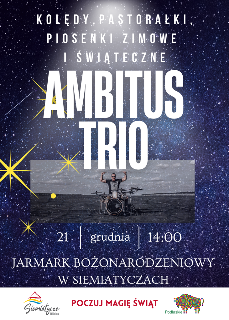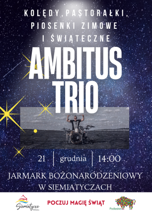 W niedzielę, 21 grudnia 2025 r. o godzinie 14:00, Siemiatycze zapraszają na wyjątkowy koncert zespołu Ambitus Trio, który odbędzie się na ulicy Pałacowej w centrum Siemiatycz, w ramach tegorocznego Jarmarku Bożonarodzeniowego. Ambitus Trio w składzie: