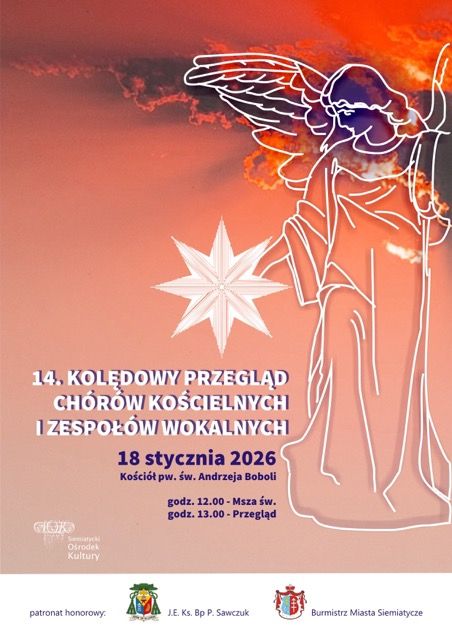 Siemiatycki Ośrodek Kultury oraz Parafia pw. Św. Andrzeja Boboli w Siemiatyczach zapraszają do udziału w XIV Kolędowym Przeglądzie Chórów Kościelnych i Zespołów Wokalnych. Wydarzenie odbędzie się 18 stycznia 2026 roku o godzinie 13:00 w kościele pw. Św. Andrzeja Boboli w Siemiatyczach. Przegląd poprzedzi uroczysta Msza Święta w intencji uczestników, która rozpocznie się o godzinie 12:00. Patronat honorowy nad Przeglądem objęli: Celem Przeglądu jest propagowanie i kontynuowanie tradycji śpiewania kolęd i pastorałek, pielęgnowanie muzyki religijnej, podnoszenie poziomu wykonawczego zespołów chóralnych, a także wymiana doświadczeń i inspirowanie wartościowej twórczości muzycznej o charakterze liturgicznym. Do udziału zapraszamy chóry działające przy parafiach i ośrodkach duszpasterskich, zespoły funkcjonujące przy instytucjach kultury oraz inne grupy wokalne i wokalno-instrumentalne z terenu Diecezji Drohiczyńskiej, nawiązujące swoją twórczością do charakteru wydarzenia. Każdy chór i zespół prezentuje dwa utwory (z możliwością przygotowania trzeciego) o tematyce bożonarodzeniowej. Na zakończenie Przeglądu wszyscy uczestnicy wspólnie wykonają kolędę „Bracia, patrzcie jeno”. Zgłoszenia można przesyłać drogą elektroniczną na adres: sok@siemiatycze.eu lub listownie na adres SOK, ul. Legionów Piłsudskiego 1, 17-300 Siemiatycze. Termin nadsyłania zgłoszeń upływa 14 stycznia 2026 roku. Informacje dotyczące udziału można uzyskać telefonicznie pod numerami: 604 912 461 lub 85 655 25 54. Wszystkie chóry i zespoły biorące udział w wydarzeniu otrzymają upominki oraz dyplomy uczestnictwa. Organizatorzy zastrzegają sobie możliwość ograniczenia liczby zgłoszeń ze względu na czas trwania Przeglądu oraz ustalenie kolejności występów poprzez losowanie. Serdecznie zapraszamy do udziału w wydarzeniu oraz wspólnego pielęgnowania tradycji kolędowania. |